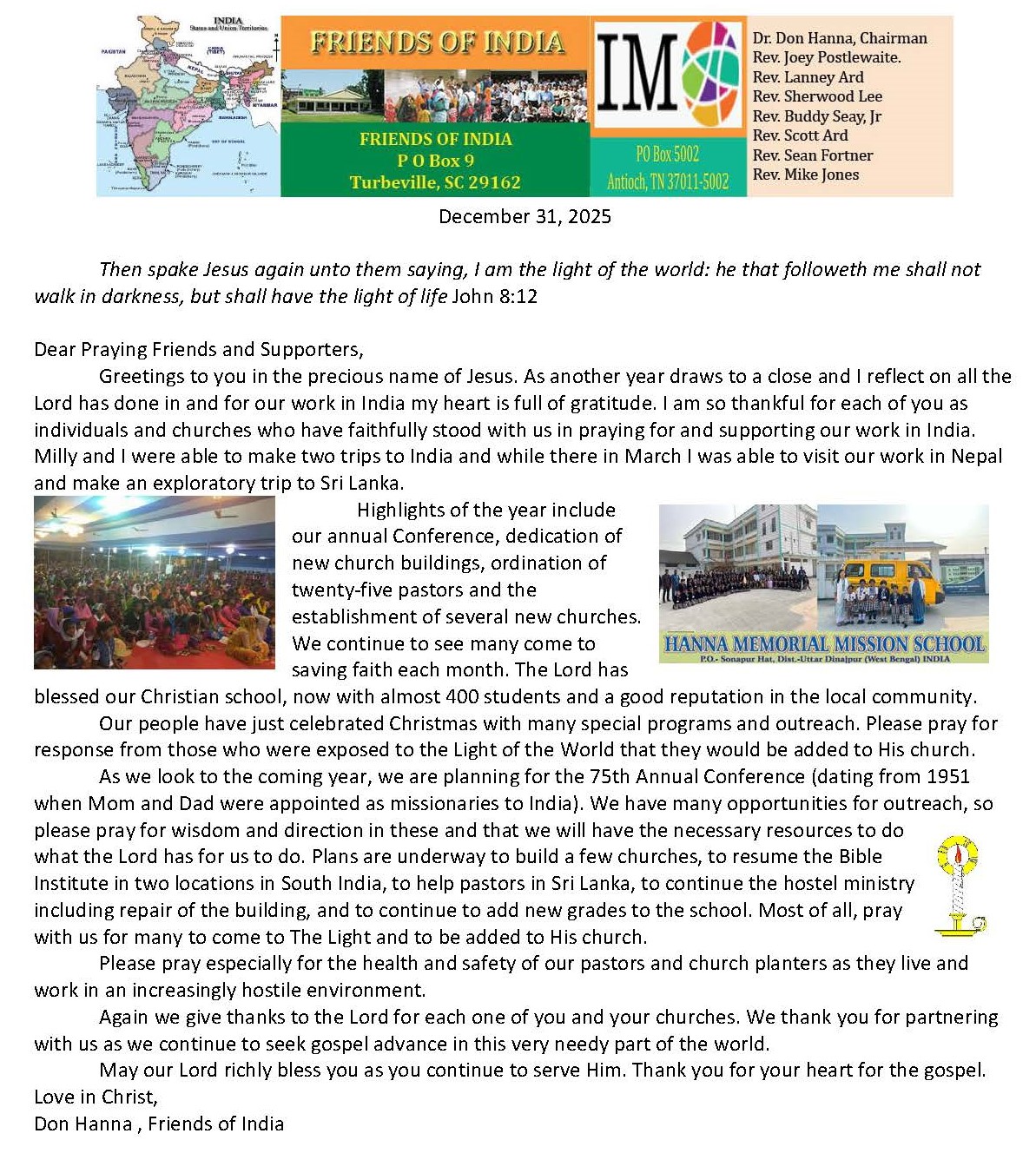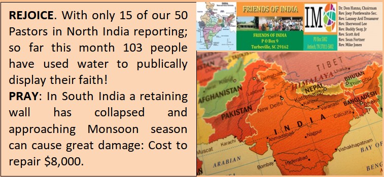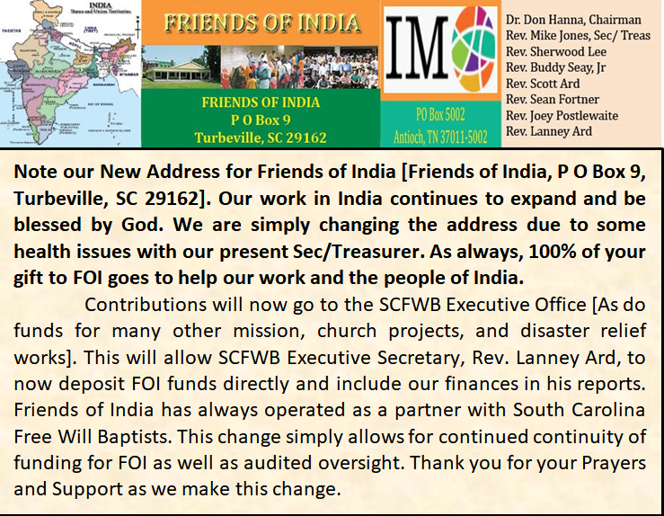 The Mission of Friends of India is to Promote and Preserve the Ministry God has developed among Free Will Baptists in India. Funds provided by contributors to Friends of India enable us to support ongoing projects while we continue to expand the ministry of reaching souls, building churches, and establishing disciples as followers of Christ. Other social, educational, and religious works such as disaster relief, Bible Institutes, and life style improvements (such as water supplies) for the people of India are helped by this ministry.